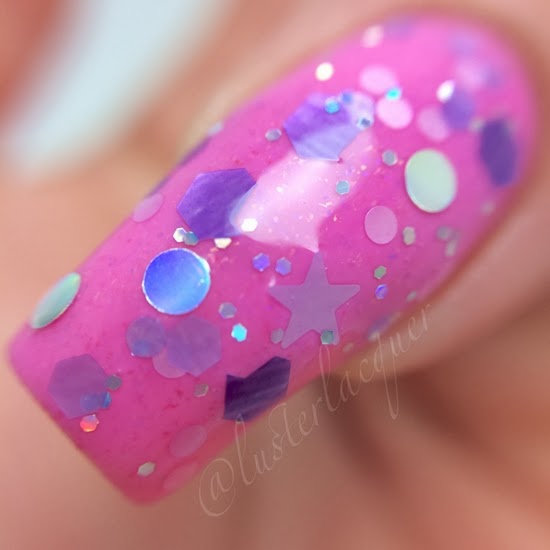 A mix of pink and silver holo glitters including hexes, circles and bar glitters. This is one dabbed coat over Heart Warming. Gah! Just gorgeous!